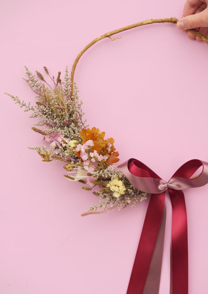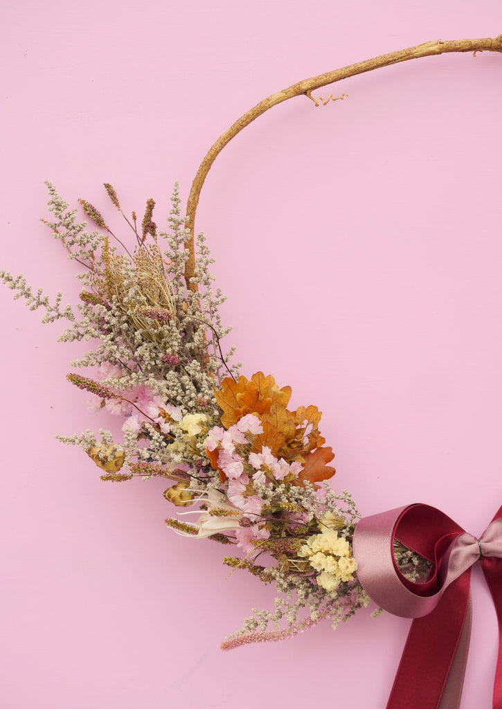 Get crafty this autumn, the perfect mindful floral activity! Bring the outside in with our autumn wreath DIY Kit. A stunning decoration for your home that will last all year round. The 'Trailing Acorn' wreath is made from vine and features pretty pink dried Statice and a sprig of preserved leaves, all highlighted with colourful cascading ribbon.