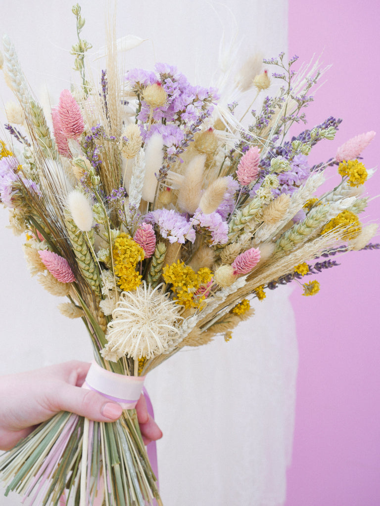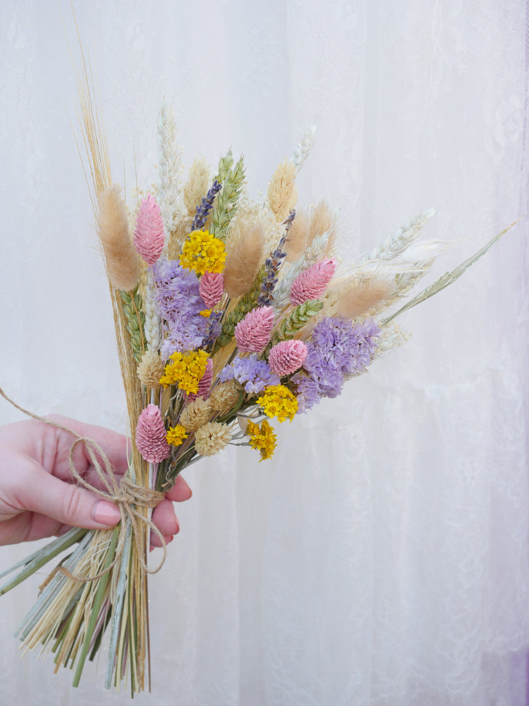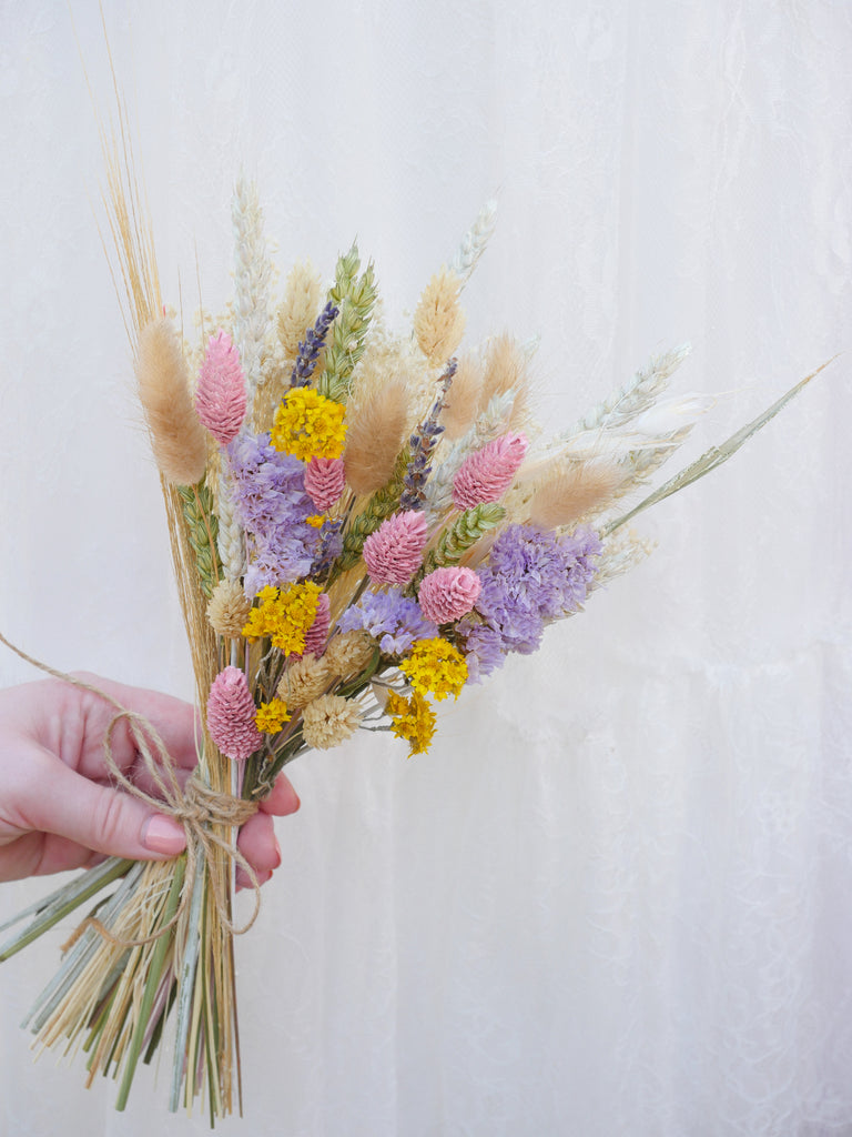 This whimsical bridesmaid bouquet is full of dried wildflowers and this is why it looks like a beautiful summer meadow! Elegant long-lasting dried flowers to hold beautiful memories of your day for time to come.
