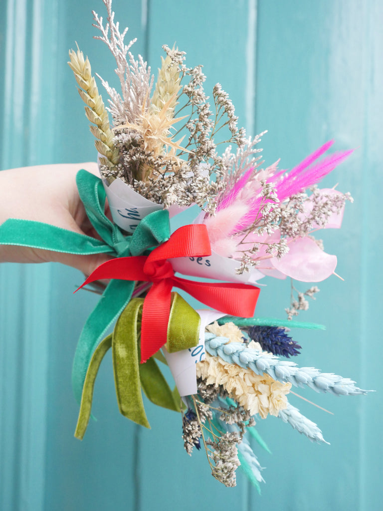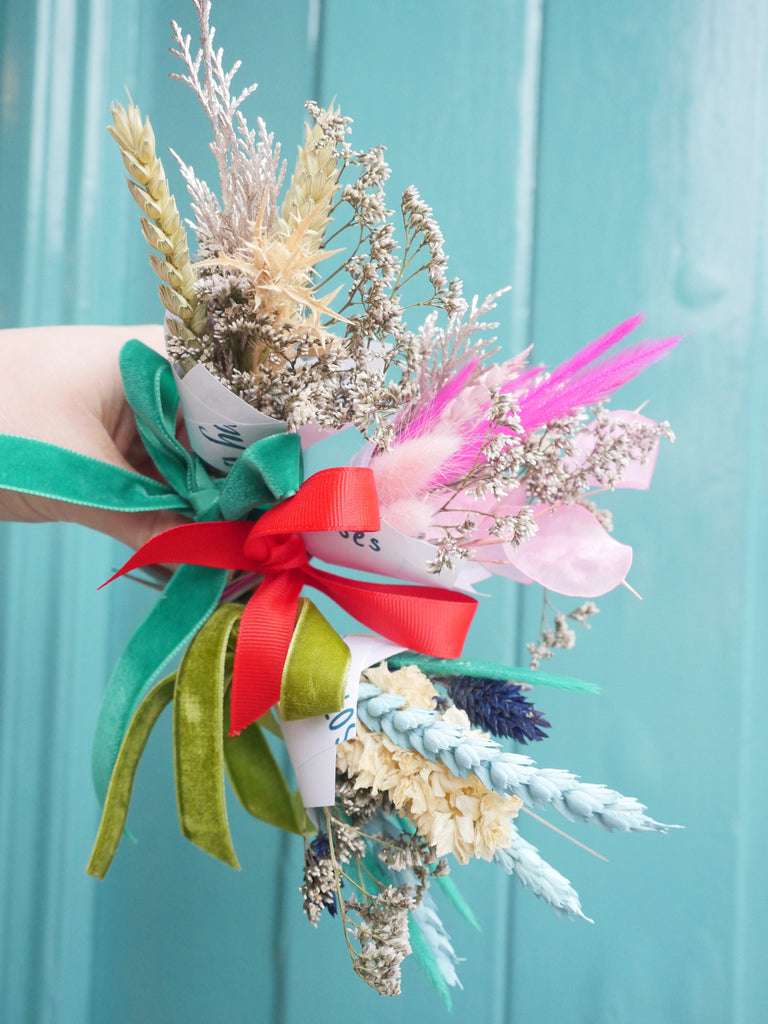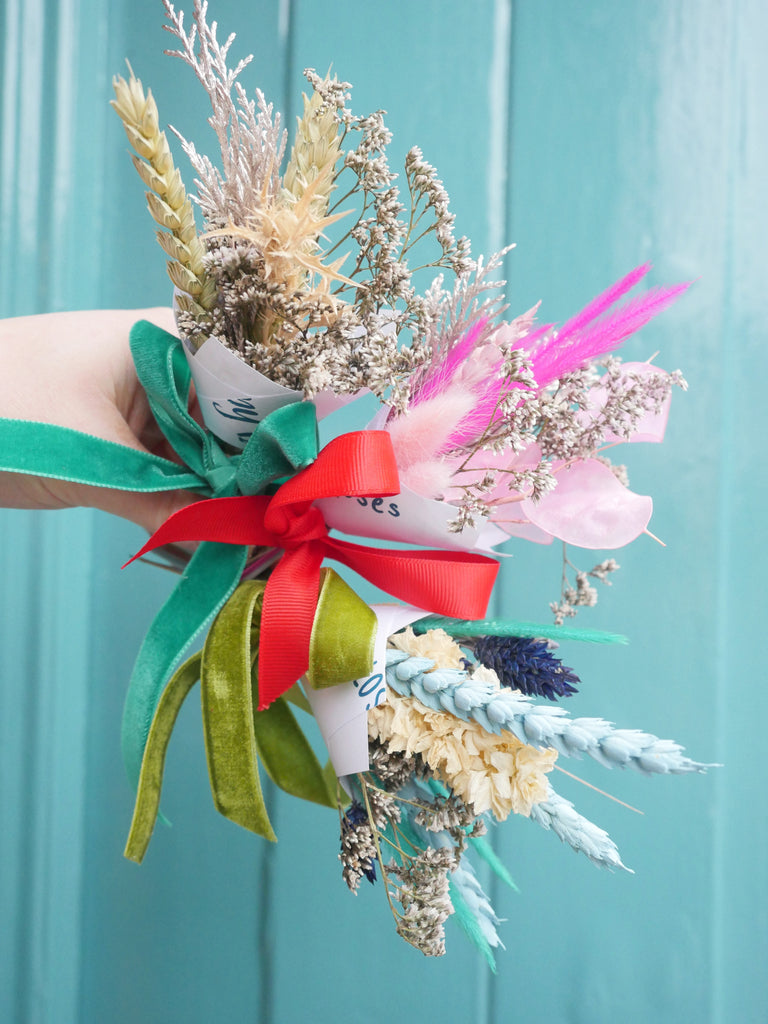 Each mini bunch is wrapped in custom, branded paper created by The Happy Blossoms with a bow. Each bunch is completely unique as these bunches are made by our small team of Florists in Dorset.