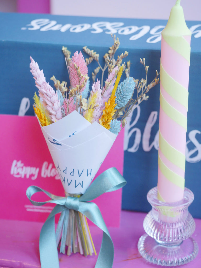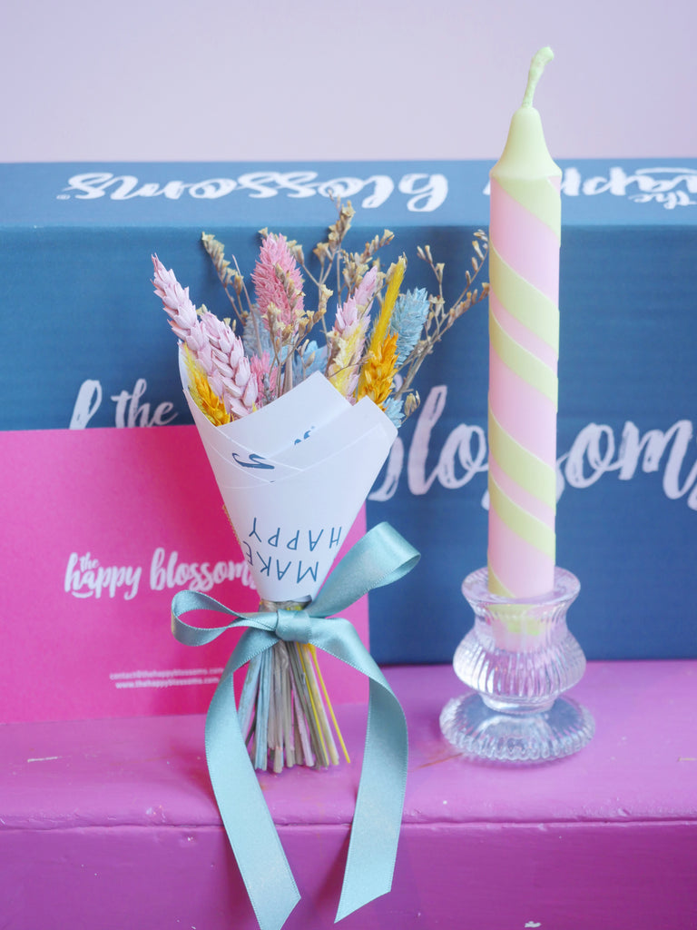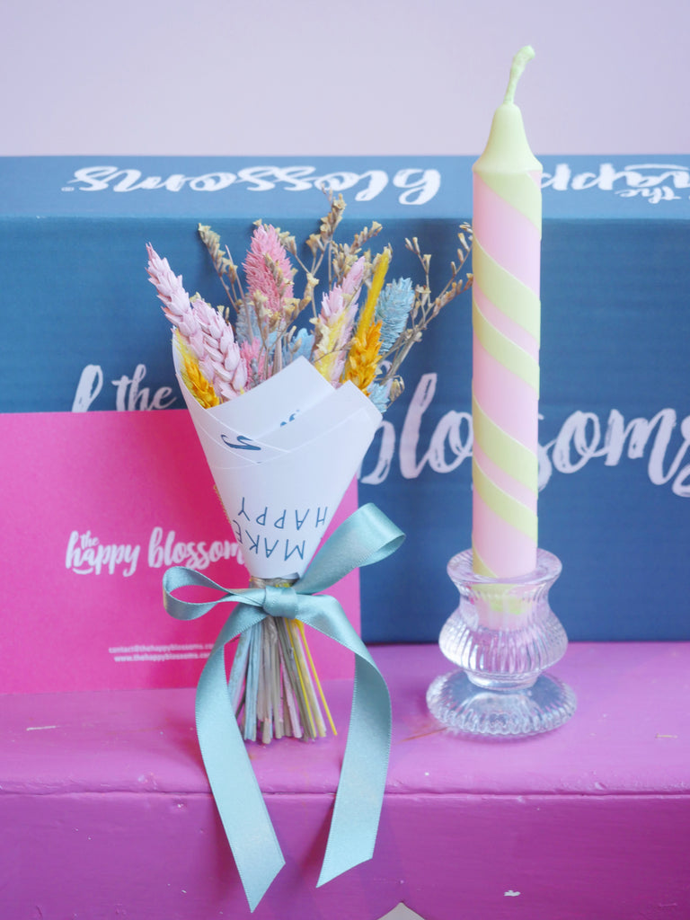The Little Light Gift Box is a beautiful gift box that contains a stunning pastel candy coloured dinner candle, intricate glass candle holder and adorable mini version of the Blooming Brimstone Baked Blossom bunch. All of these gifts come in out bespoke gift boxes for a stunning gift for a loved one.