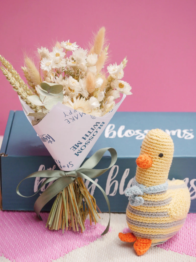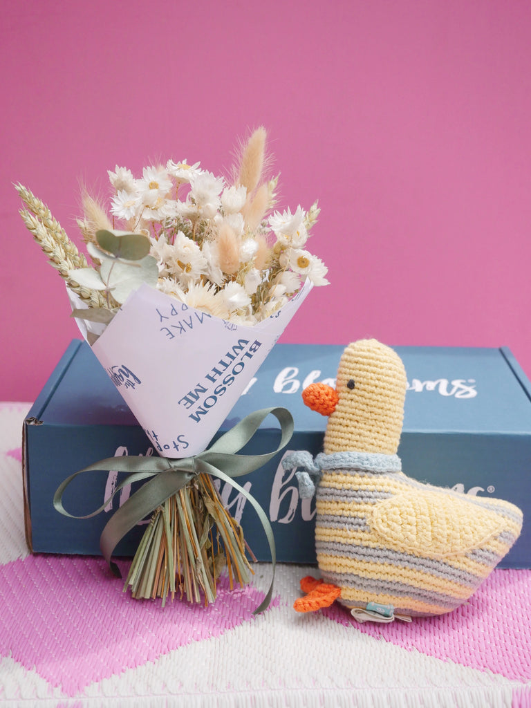 This adorable crochet Pebblechild duck rattle is a fantastic way to greet any brand new bundle of joy, beautifully packaged in our THB gift box along with a petite colorful vase containing dried Rodanthe that's nursery-ready. The ideal gift for a new addition.