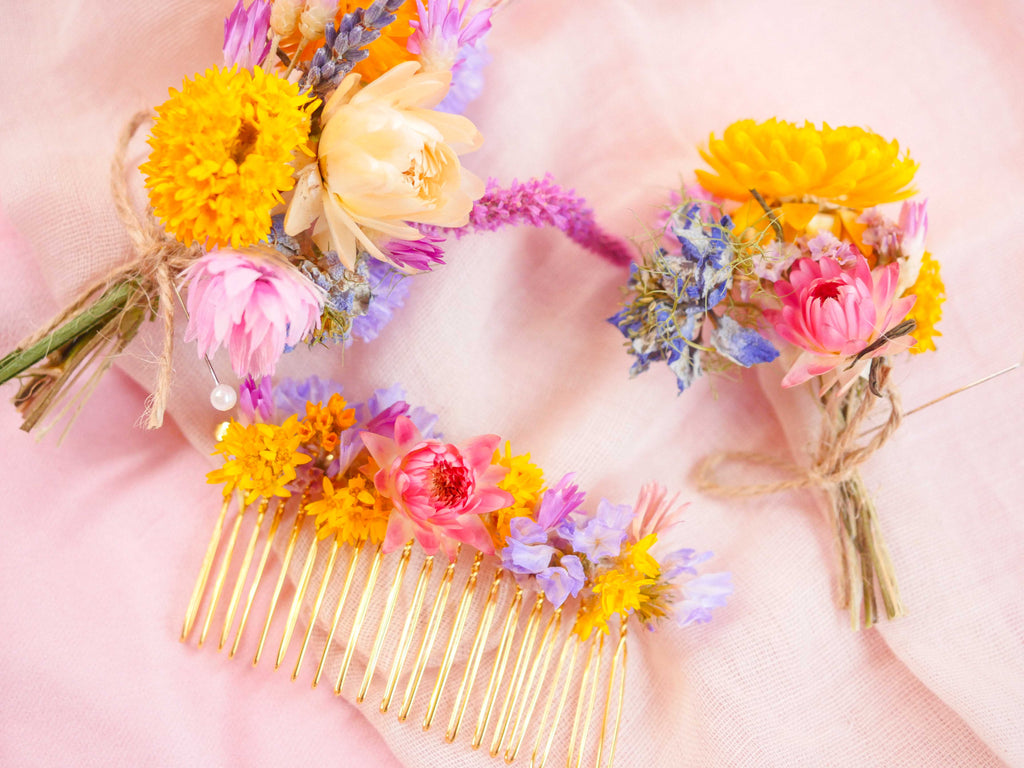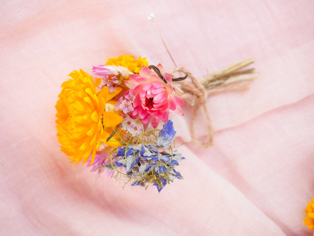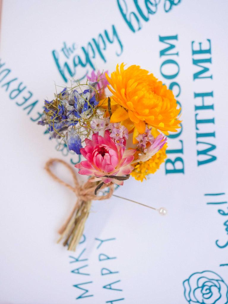 Enhance your special day with vibrant and striking hues with The Botanical Grove Dried Flower Baked Blossom Boutonnière. This vibrant collection of dried blooms boasts a cheerful palette. These enduring flowers not only add beauty to your wedding but also hold sentimental value that will last a lifetime.