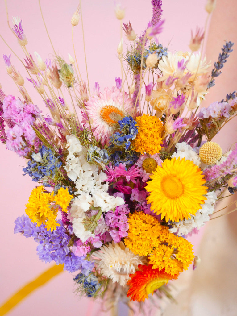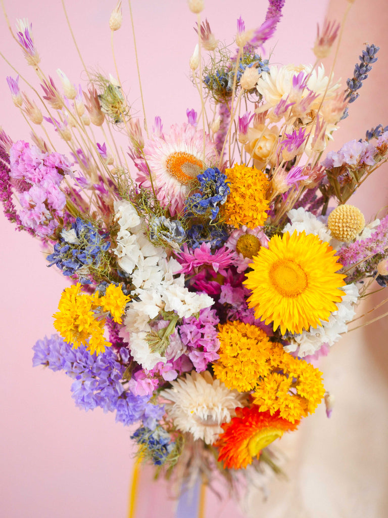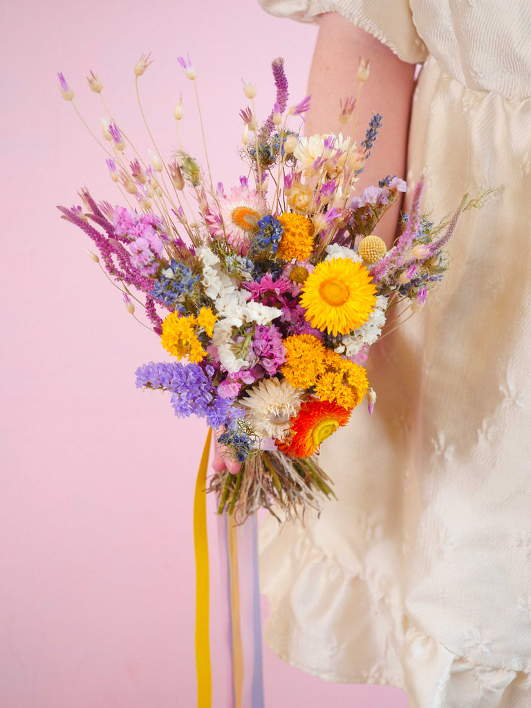 Enhance your special day with vibrant and striking hues with The Botanical Grove Dried Flower Baked Blossom Bridesmaid Bouquet. This vibrant collection of dried blooms boasts a cheerful palette. These enduring flowers not only add beauty to your wedding, but also hold sentimental value that will last a lifetime.