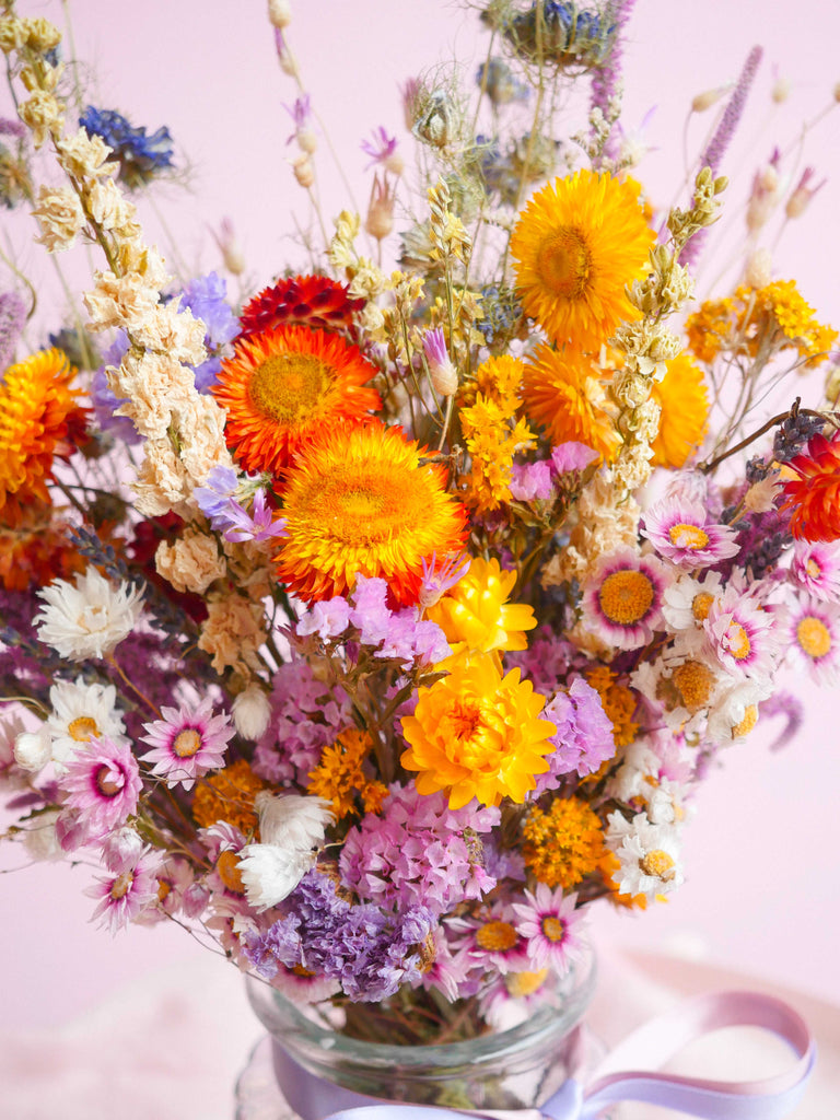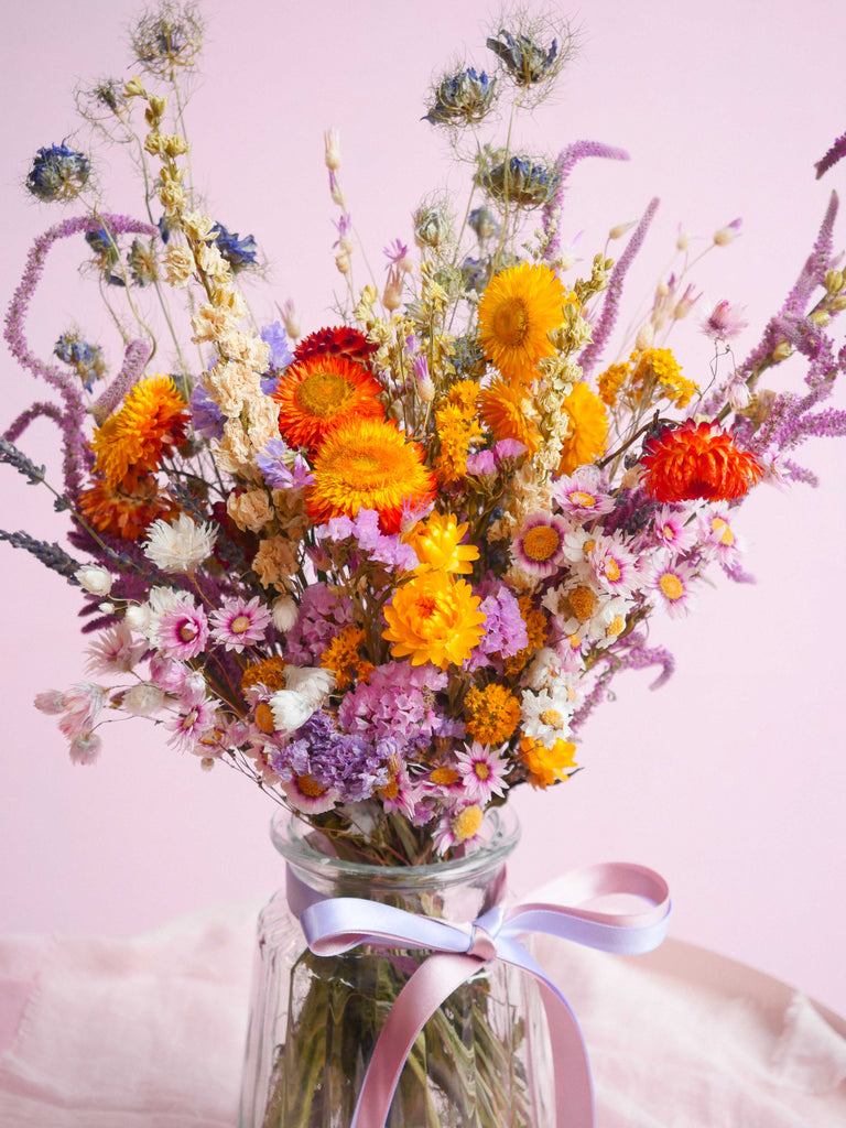 Enhance your special day with vibrant and striking hues with The Botanical Grove Dried Flower Baked Blossom Table Centre Bouquet. This vibrant collection of dried blooms boasts a cheerful palette. These enduring flowers not only add beauty to your wedding but also hold sentimental value that will last a lifetime. The perfect addition to your wedding breakfast tables!