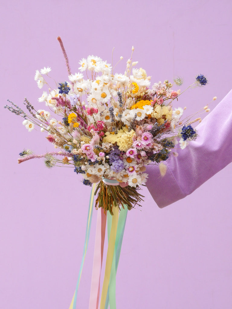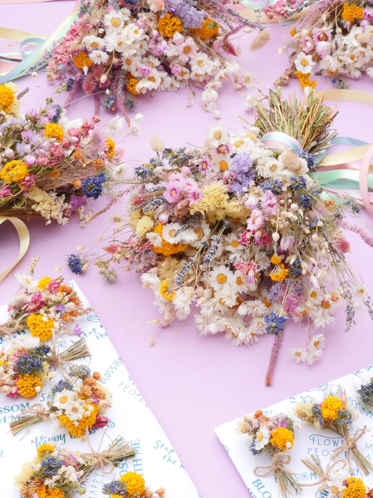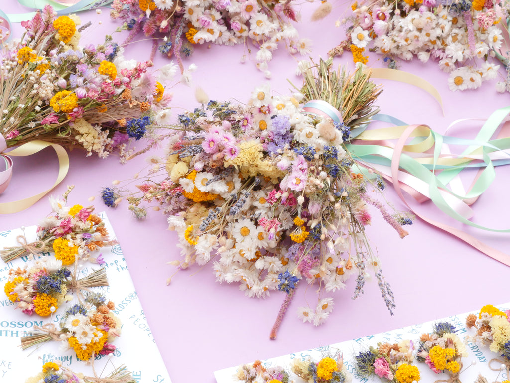 The Cutting Garden dried flower baked blossom bridal bouquet is a stunning bridal bunch of dried flowers. Packed full of colour and pure joy, this bouquet is guaranteed to bring sunshine to your wedding day. Elegant long-lasting dried flowers to hold beautiful memories of your day for time to come.