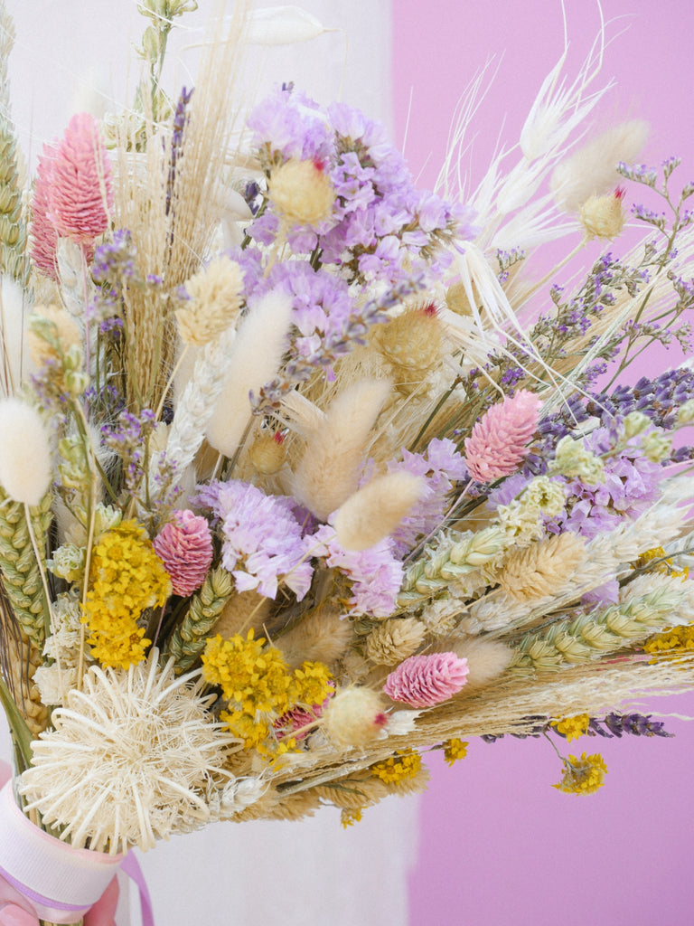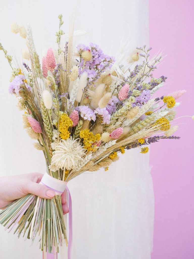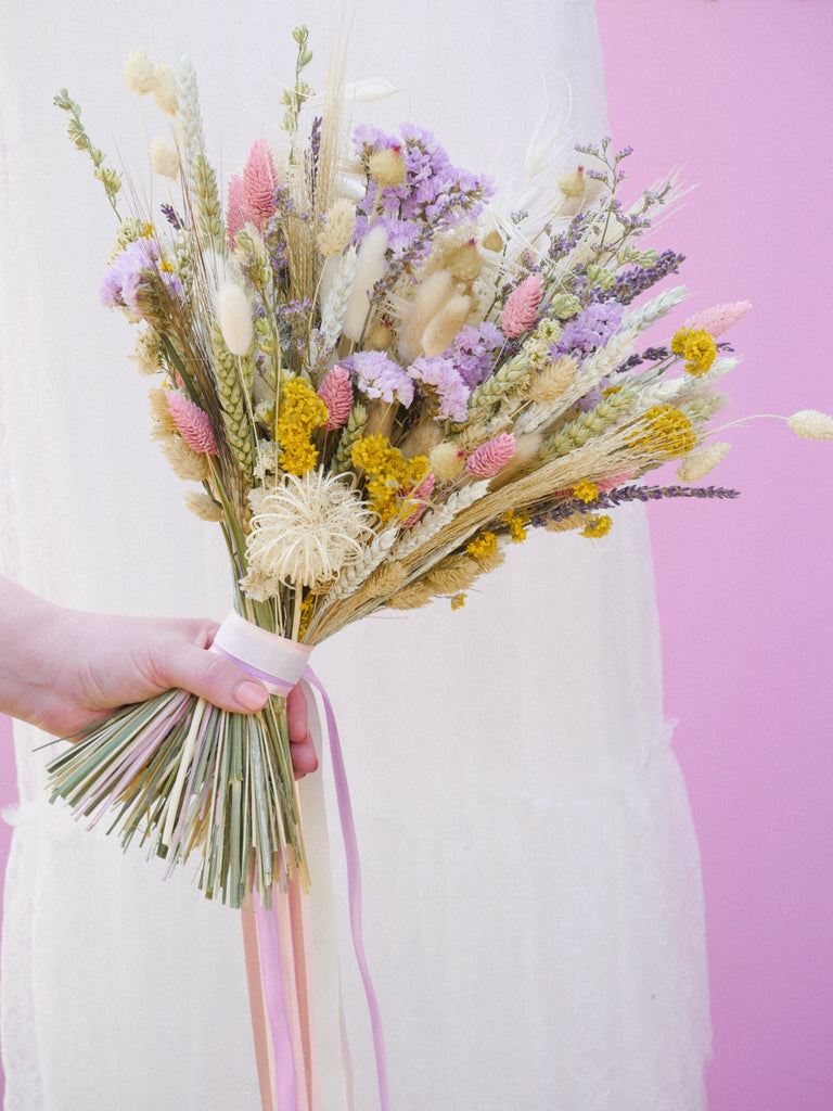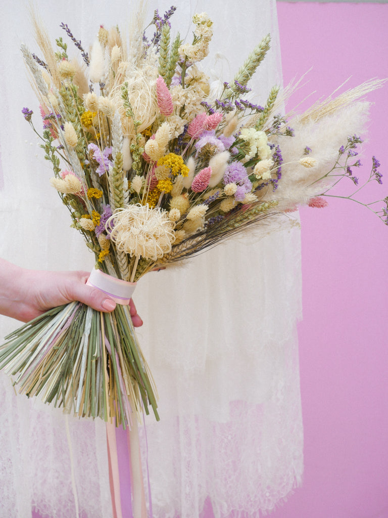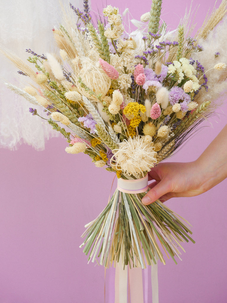 This whimsical bridal bouquet is full of dried wildflowers and this is why it looks like a beautiful summer meadow! Elegant long-lasting dried flowers to hold beautiful memories of your day for time to come.
