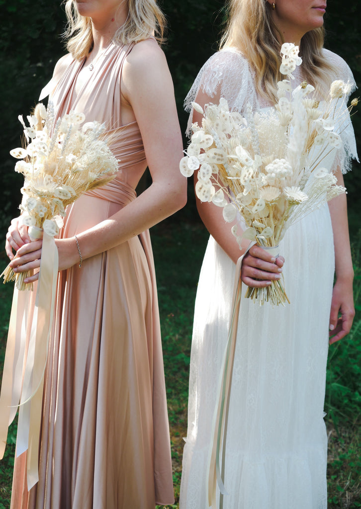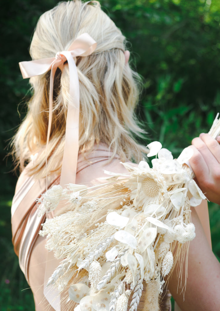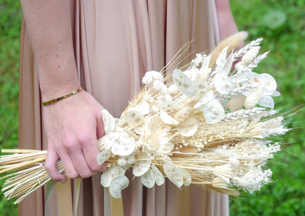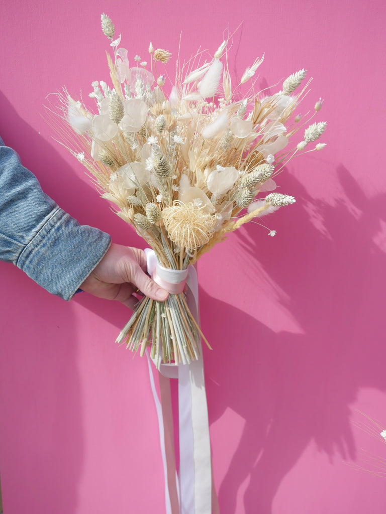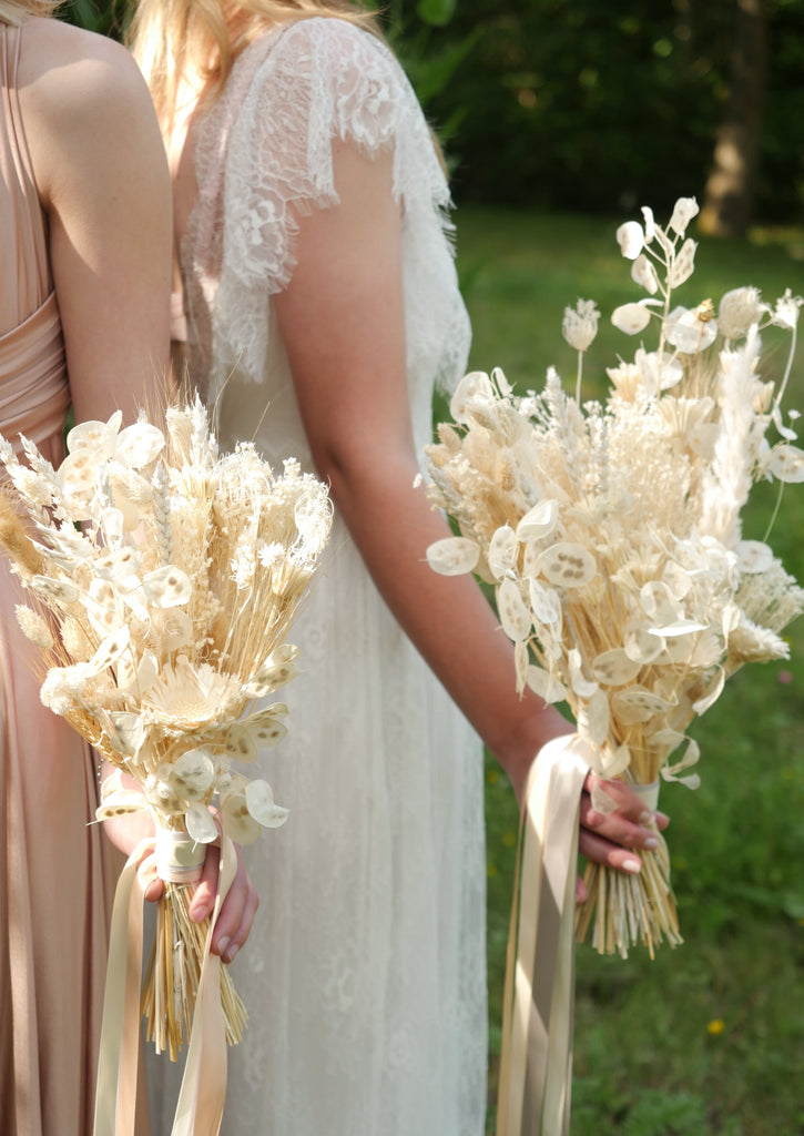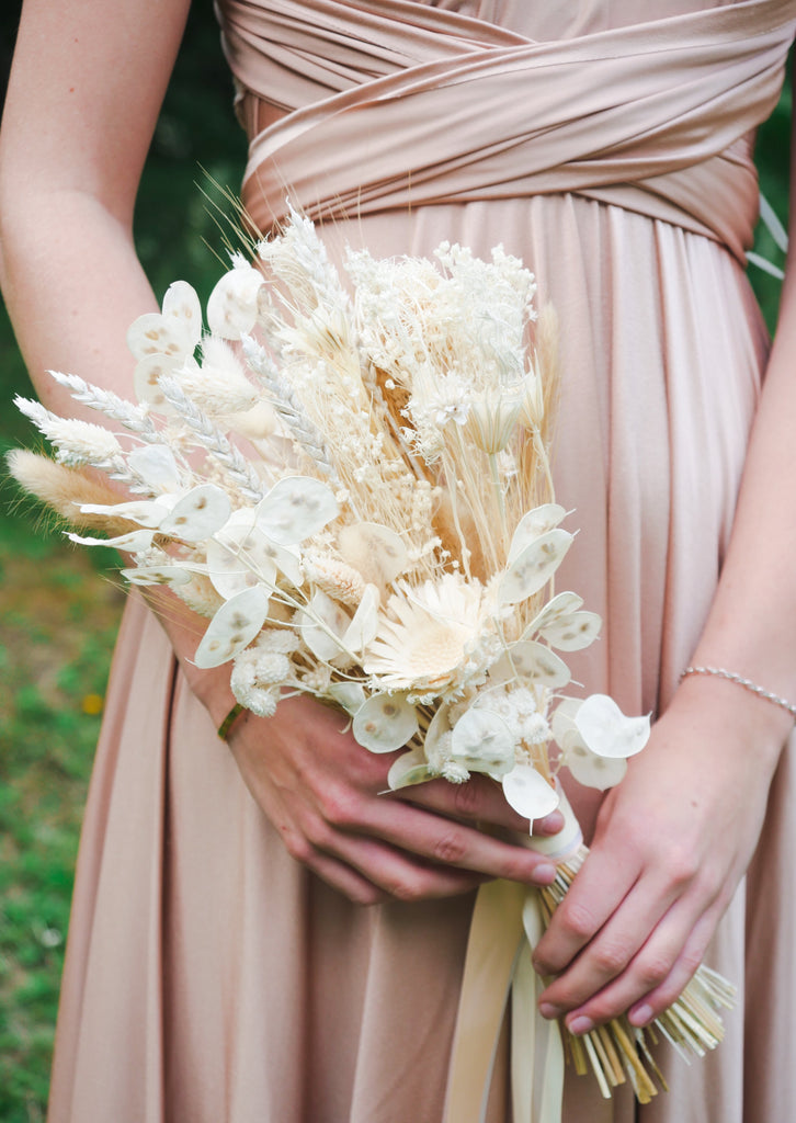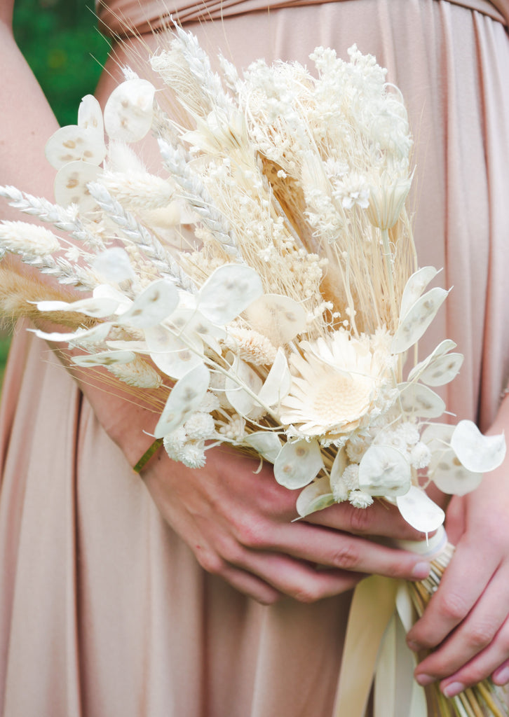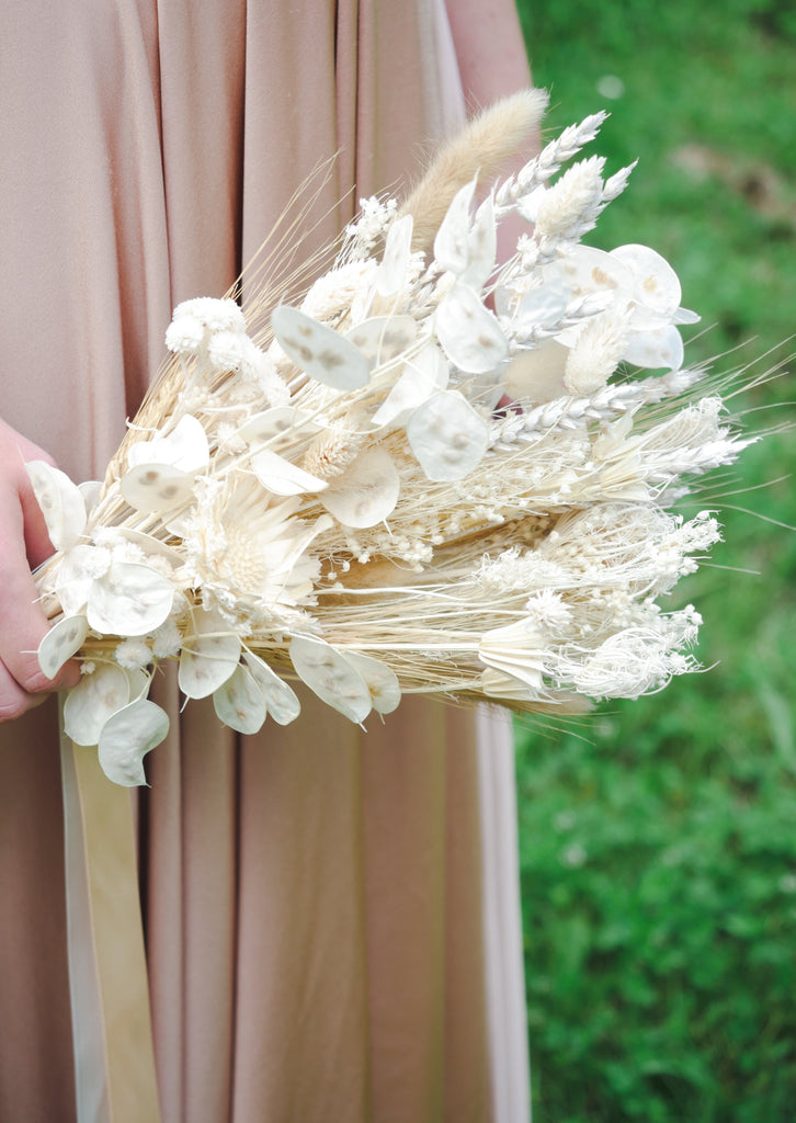 Prepare to be whisked away to the day of your dreams by this alluring white and cream dried bridesmaid bouquet. More traditional in style, made with captivating dried honesty, dried wheat, graceful dried white nigella and fennel hand tied together in cascading elegant ribbons. Save and care for this dried bouquet as a keepsake and a reminder of your special day.