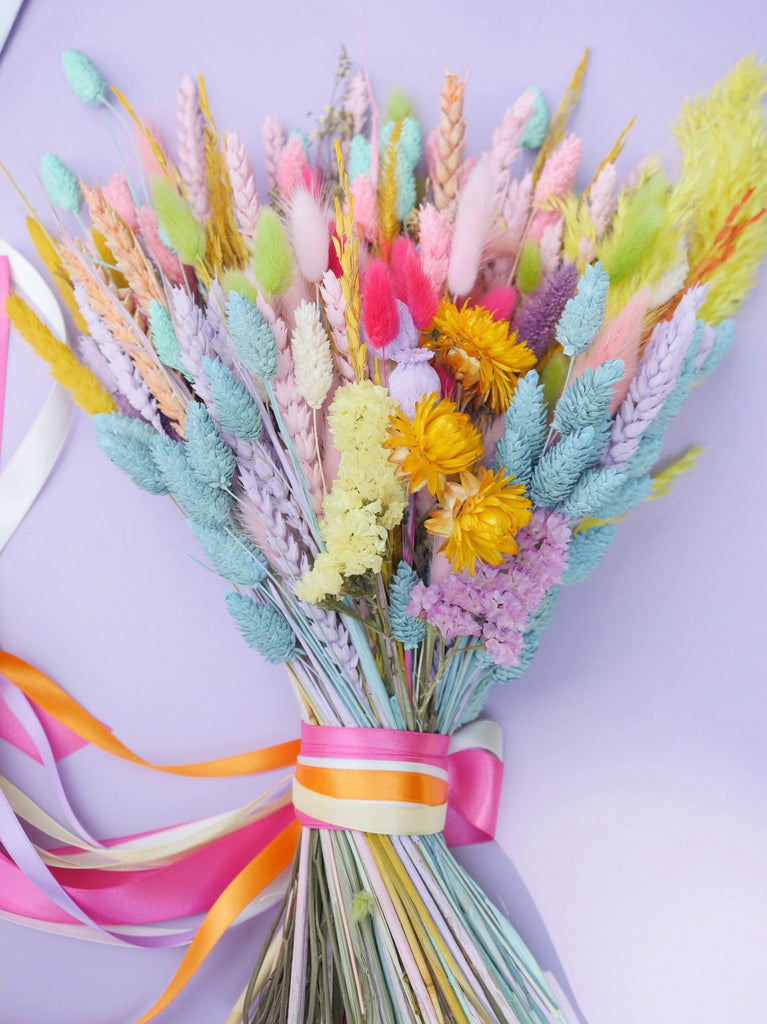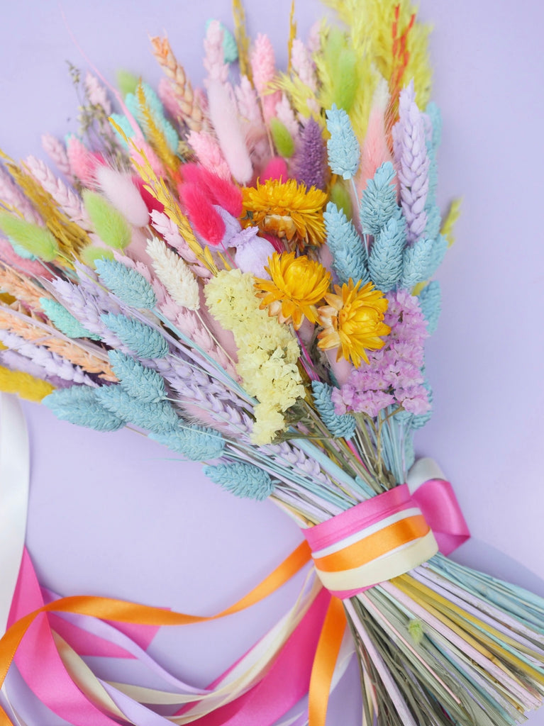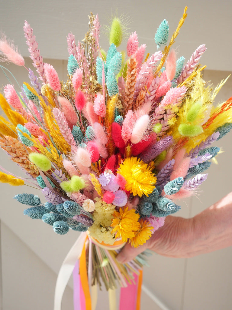 The Sherbert Macaroon dried flower baked blossom bridal bouquet is our most popular bouquet created into a stunning and unforgettable bridal bouquet! Packed full of colour and pure joy, this bouquet is guaranteed to bring sunshine to your wedding day. Elegant long-lasting dried flowers to hold beautiful memories of your day for time to come.