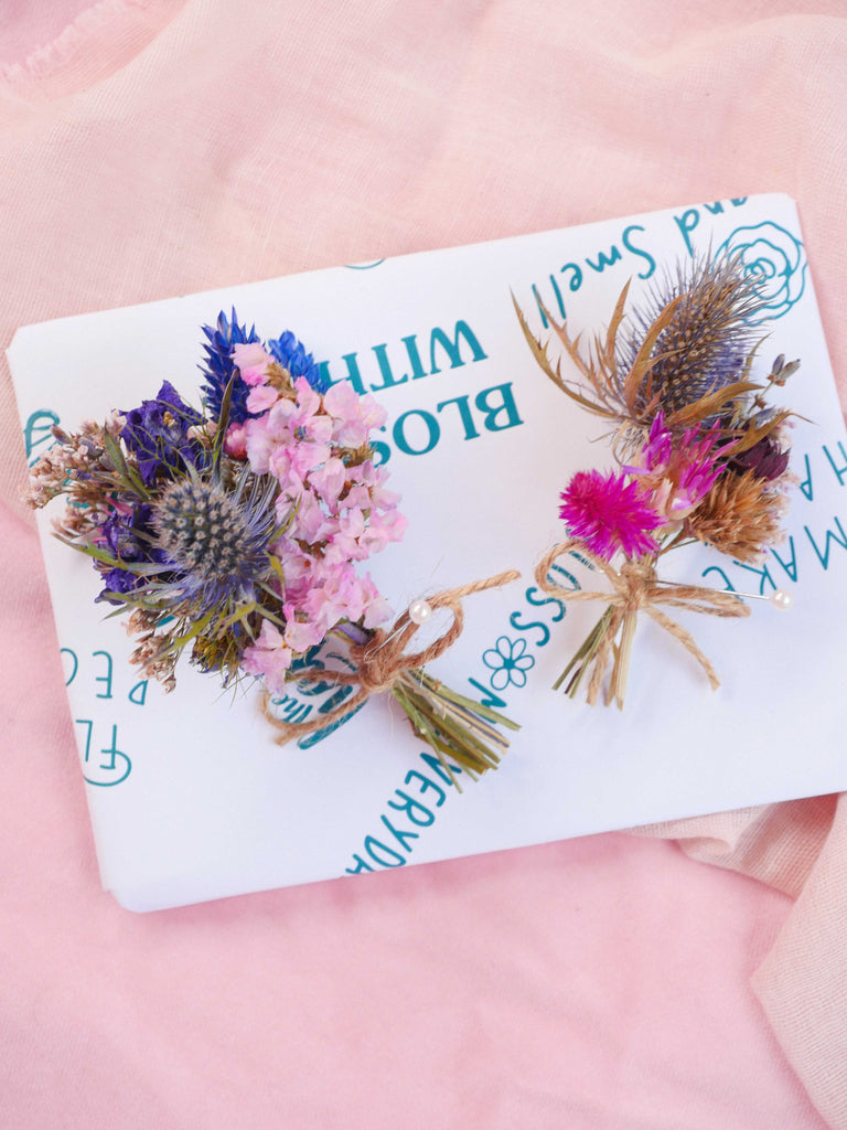 Your Baked Blossoms Boutonnière will arrive with two pins ready to wear attached to a card and wrapped securely in a bed of tissue paper, accompanied by a special care card to help you look after your flowers before and after the event.