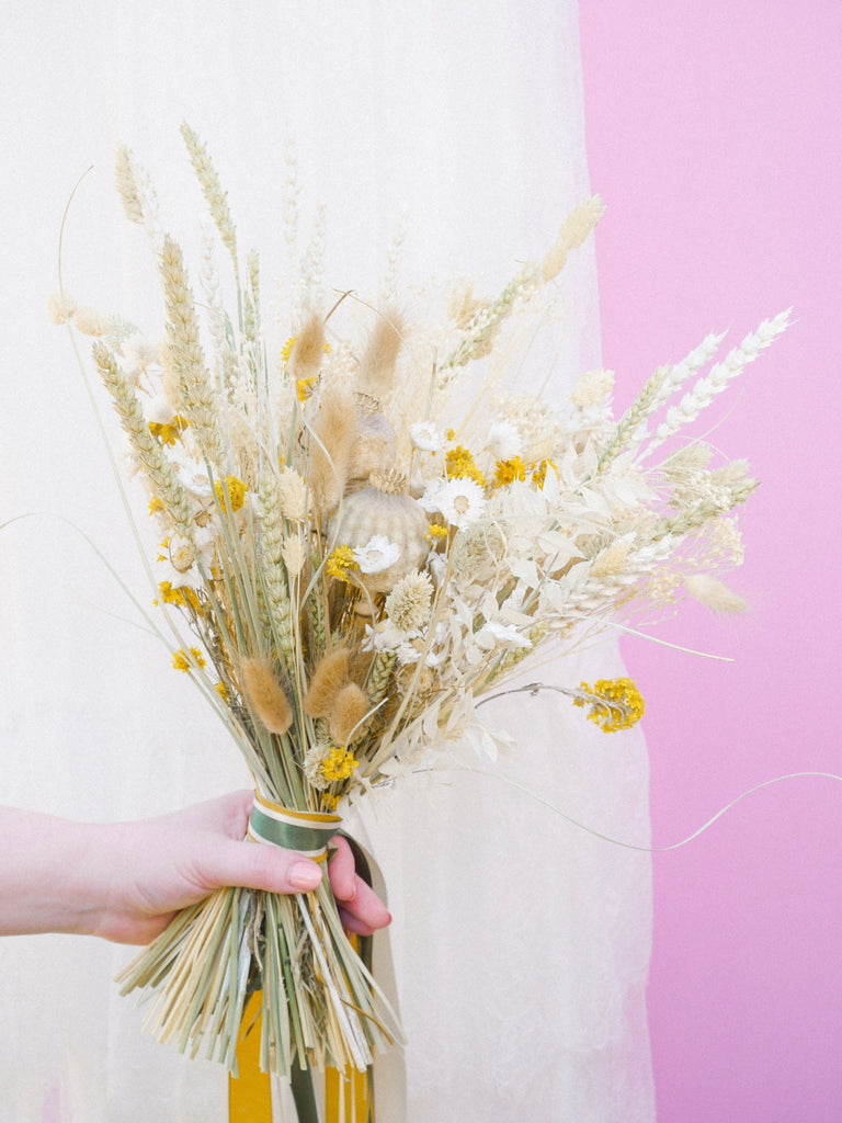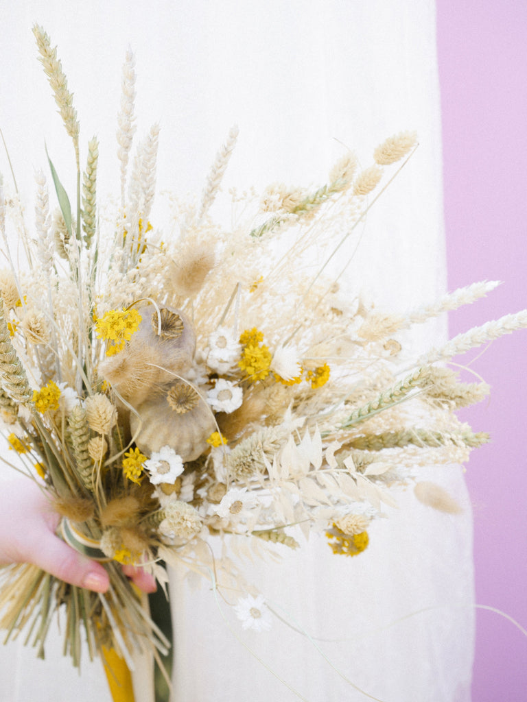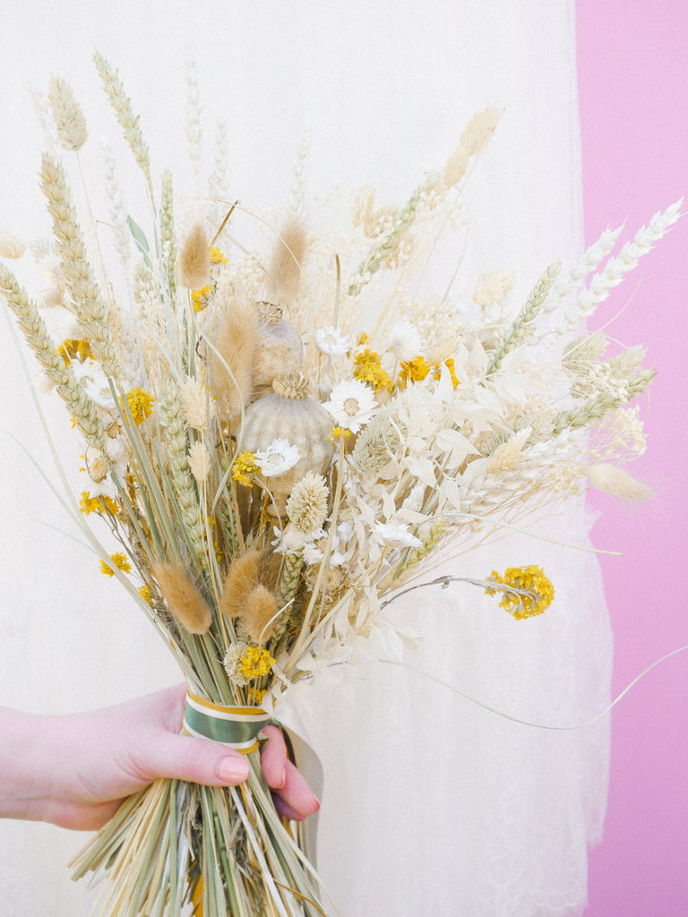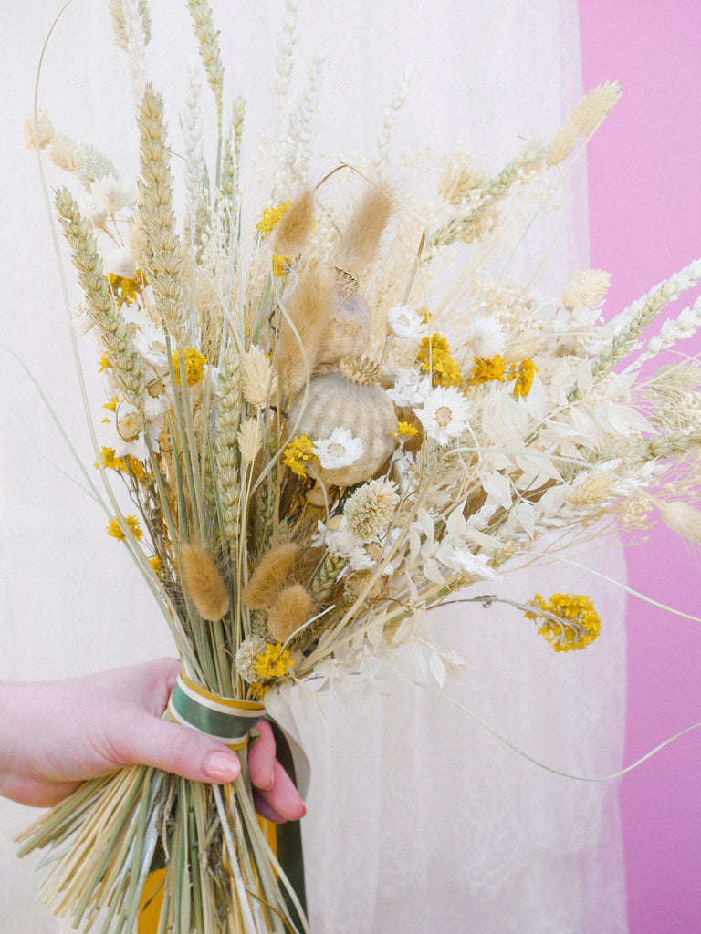 The Little Meadow bouquet is a beautiful soft arrangement of natural, white and yellow dried flowers, hand-tied into a stunning bridal bouquet. A stunning arrangement, perfect for your special day. Elegant long-lasting dried flowers to hold beautiful memories of your day for time to come.