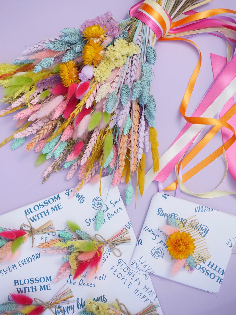 To accompany your 'Sherbert Macaroon' wedding bouquet is our hair comb, made in the same style. Featuring colourful dried wheat and Phalaris, hand-made onto a gold hair comb - a beautiful accessory to wear and keep as a keepsake.