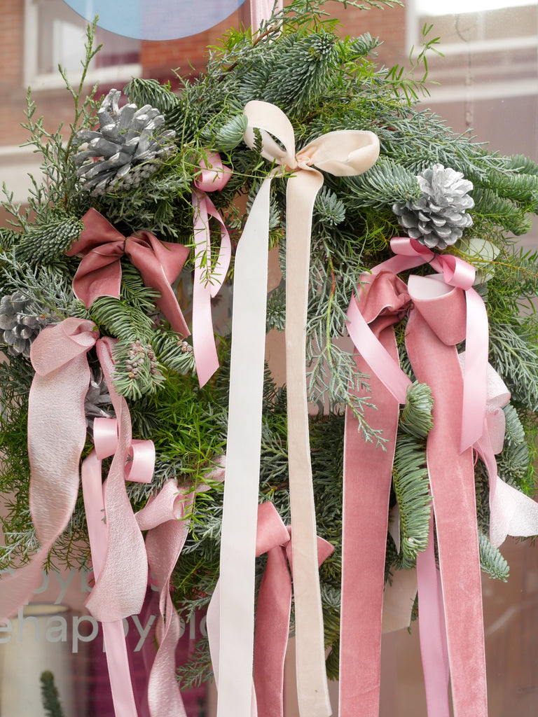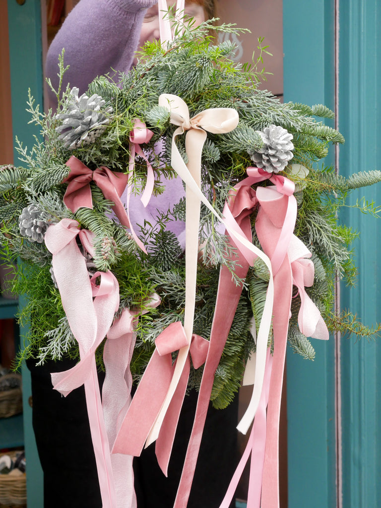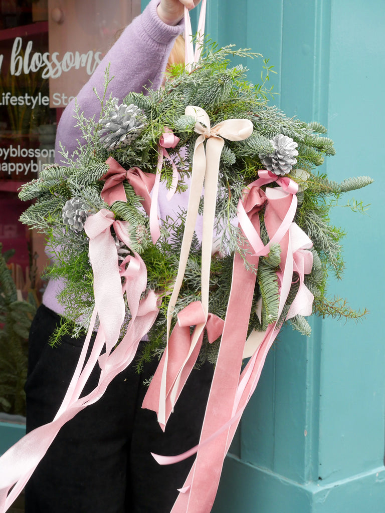 Meet the wreath that brings all the festive glamour. Our Pretty In Pink Luxury Christmas Fresh Wreath is handmade in our Dorset studio with fresh, fragrant evergreens and finished with flowing blush ribbons, velvet bows, and frosted pinecones for that soft, romantic sparkle.