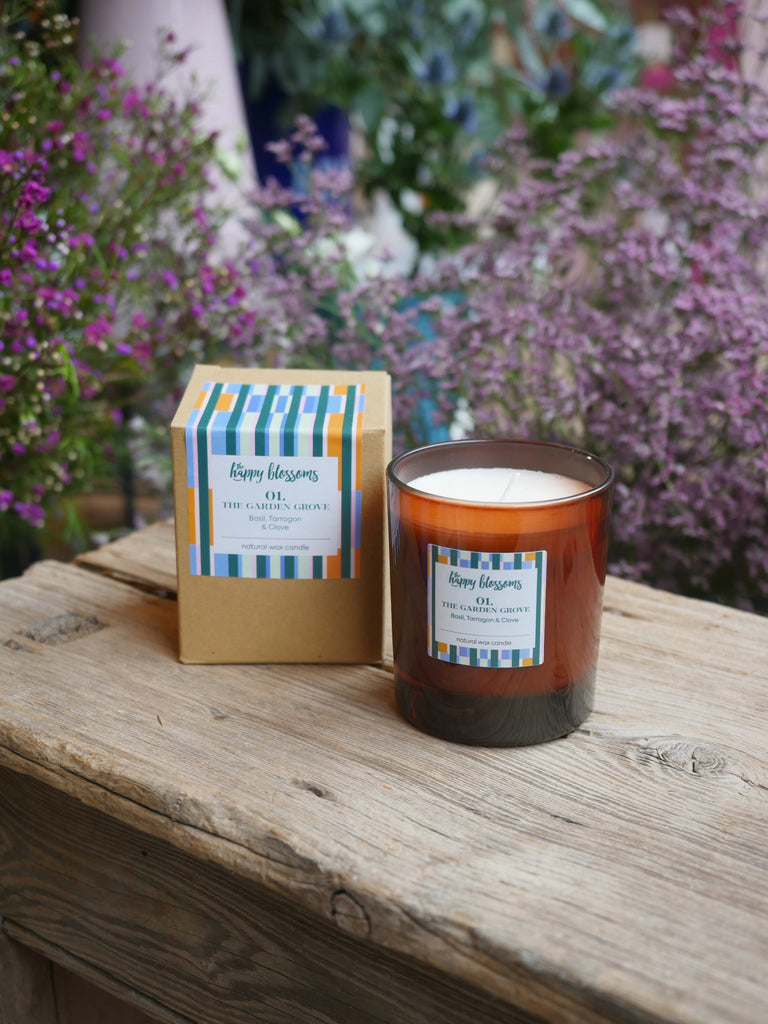 Discover this beautiful natural wax-scented candle by The Happy Blossoms. Bring the garden indoors with the uplifting aroma of our Garden Grove Candle. Hand-poured with 100% natural wax, this candle is infused with a blend of aromatic basil, fresh green leaves, tarragon, spicy anise and clove.