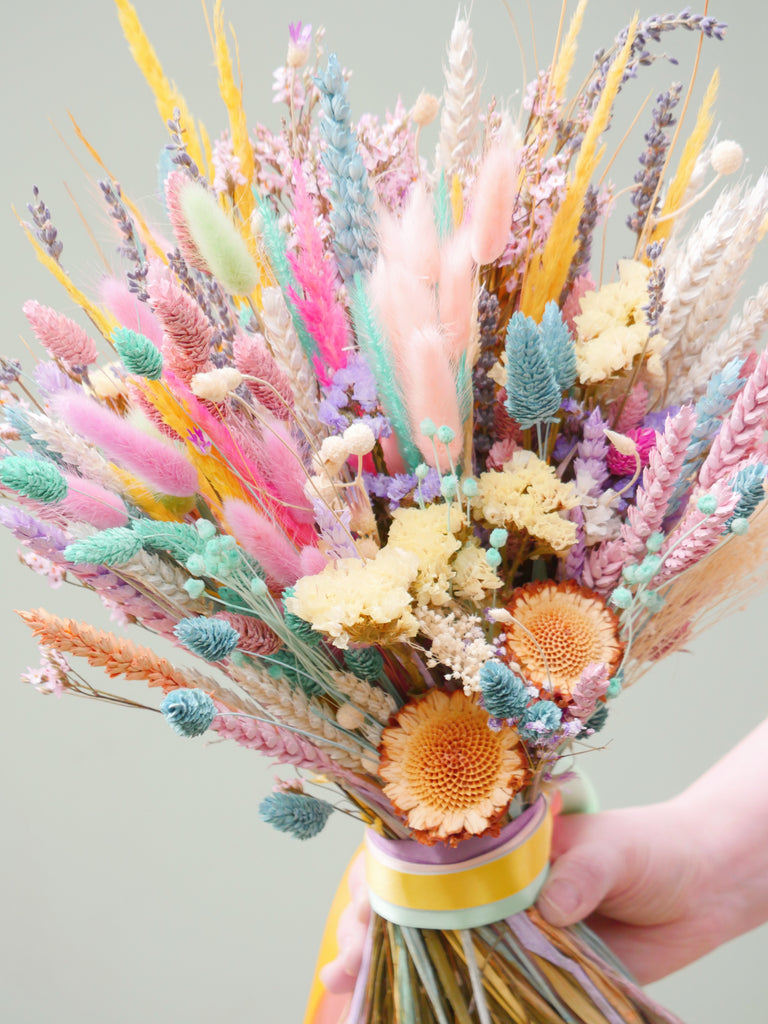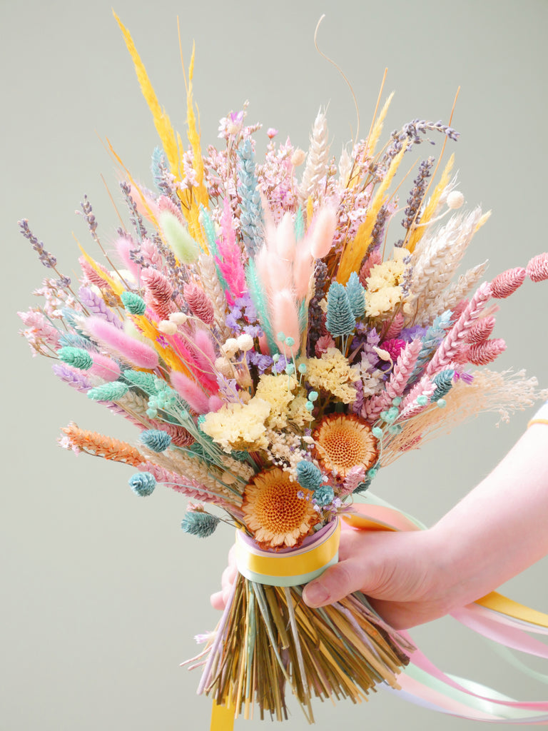 The Popping Candy dried flower baked blossom bridal bouquet is a stunning bridal bunch of dried flowers. Packed full of colour and pure joy, this bouquet is guaranteed to bring sunshine to your wedding day. Elegant long-lasting dried flowers to hold beautiful memories of your day for time to come.