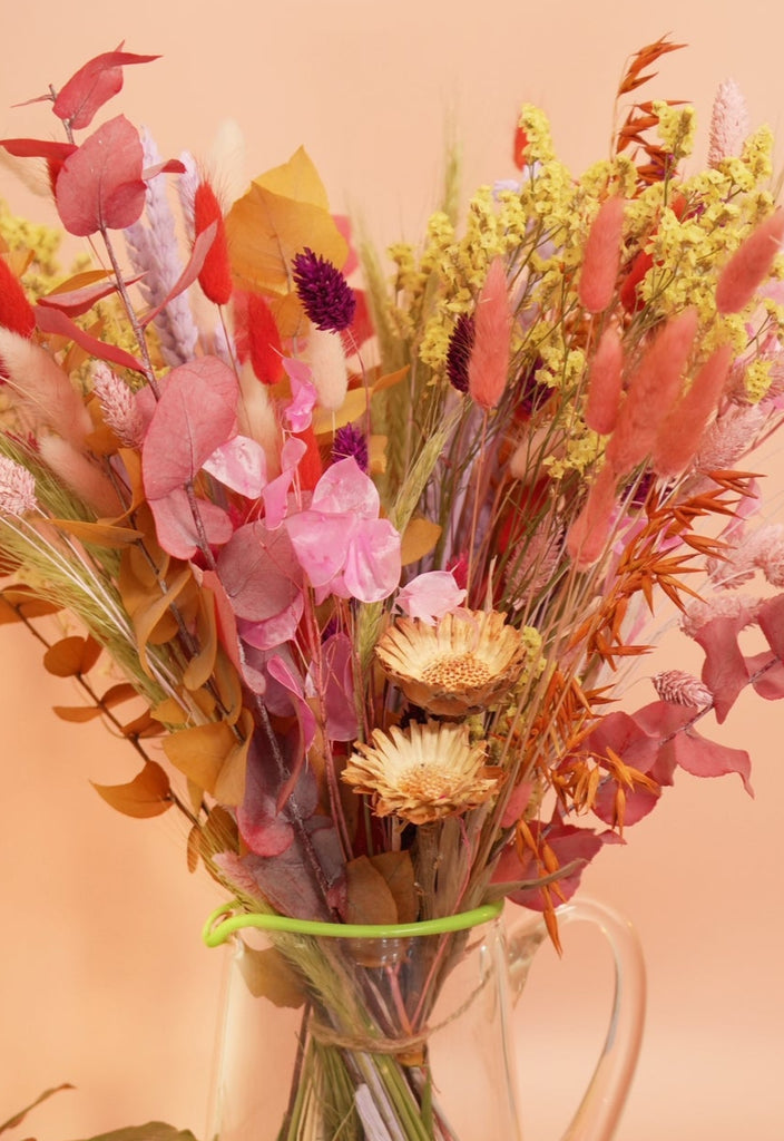 The bunch is full of beautiful pinks, yellow and burgundy's mixed with lovely natural grasses and autumnal foliage. Each bunch features a carefully curated mix of dried and preserved flowers that may be painted, dyed, or left in their natural autumn hues.