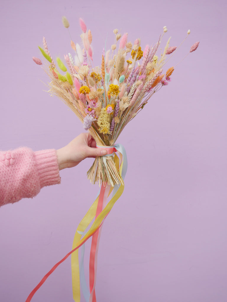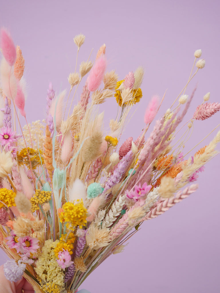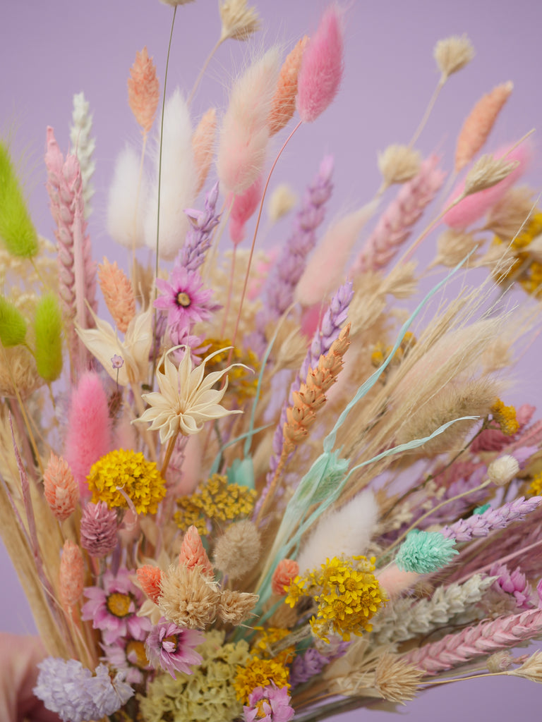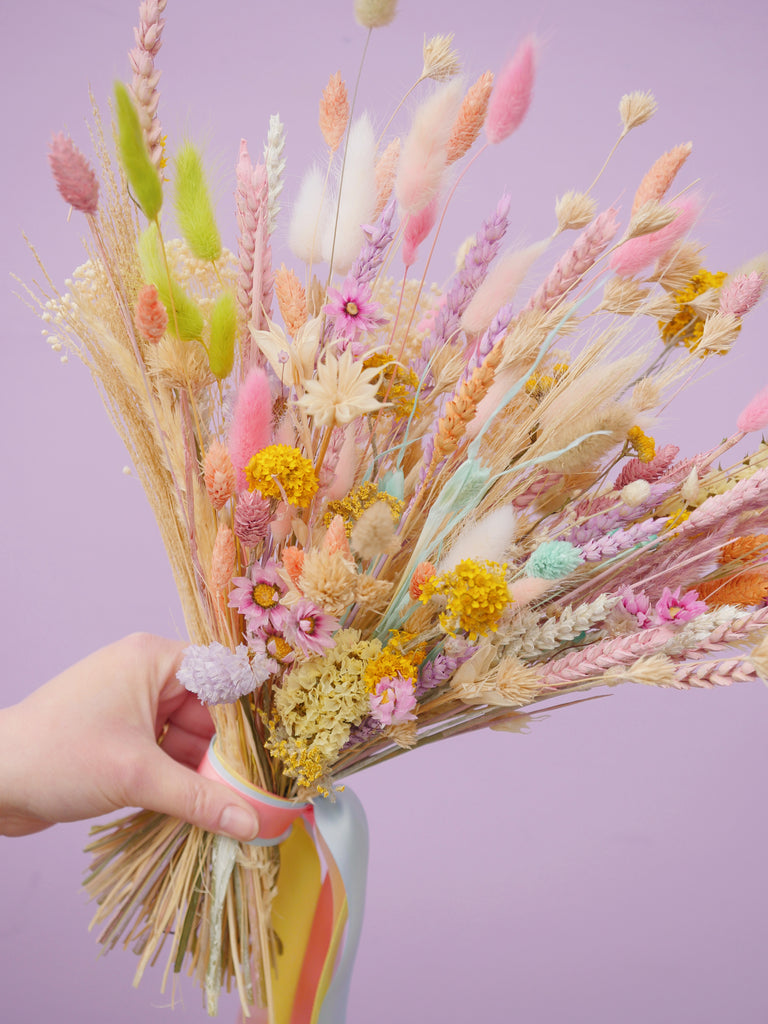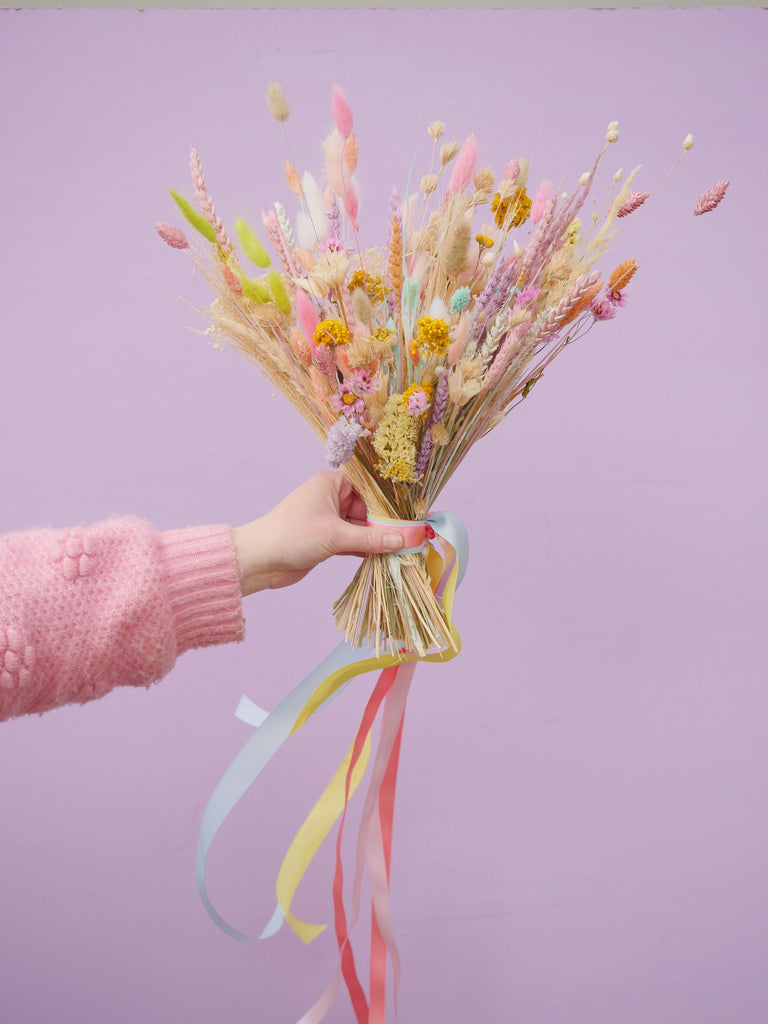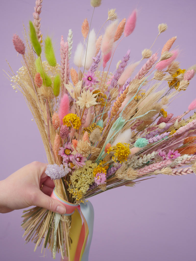 The Sugar Plum dried flower baked blossom bridal bouquet is a stunning bridal bunch of dried flowers. Packed full of colour and pure joy, this bouquet is guaranteed to bring sunshine to your wedding day. Elegant long-lasting dried flowers to hold beautiful memories of your day for time to come.